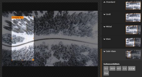 Damit die Bildausschnitte für die Kacheln schneller definiert werden können, wurde dem Bildausschnittsdialog die Seitenverhältnisse 2:1 und 1:2 hinzugefügt. Zur optimalen Bildausgabe können die Bildgrössen skaliert werden (siehe Seite Inhaltselemente-Bilder).